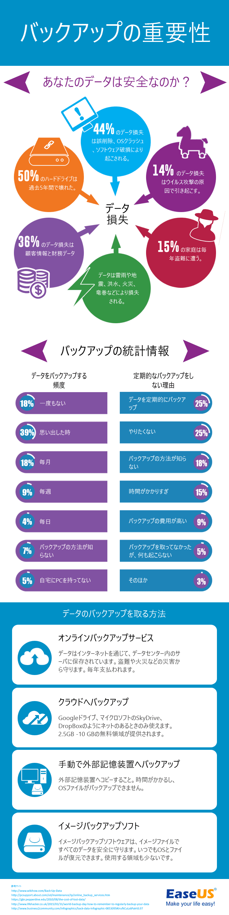 重要なデータは何らかの原因で予期せずに消失してしまったことはよくあります。データ損失を避けるために、重要なファイルやフォルダを定期的にバックアップしておいたほうがいいです。 バックアップソフトはバックアップ、ディスククローン、ディザスタリカバリソリューションなどの機能が付いて、ワンクリックでシステム、ファイルおよびアプリケーションをバックアップすることができます。以下のインフォグラフィックでバックアップの重要性をご覧になった後、友達へ共有しましょう。