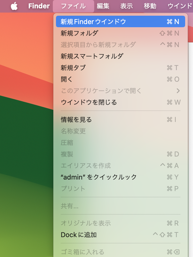 ステップ1.Finder>ファイル>新規Finderウィンドウを開きます。Command+Nのショートカットキーで新規Finderウィンドウを開くこともできます。
