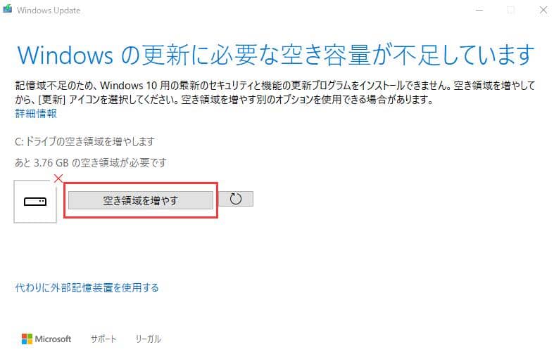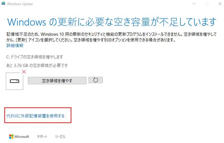 ステップ4.それでも解決しない場合は、空の外付けハードディスクをPCに接続し、「Windowsの更新に必要な空き容量が不足しています」が出たら、「代わりに外部記憶装置を使用する」をクリックします。