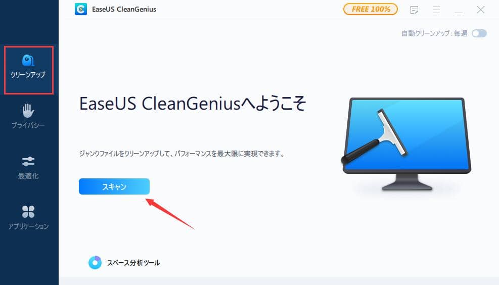 ステップ1. EaseUS Windows Geniusを起動し、「クリーンアップ」で「スキャン」をクリックします。