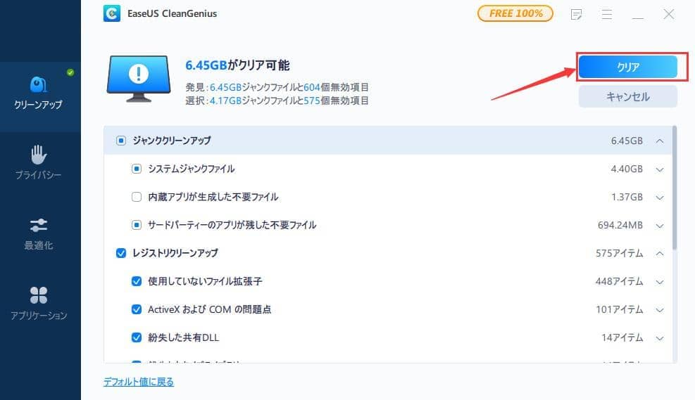 ステップ2.スキャンすると、ジャンクファイルが検出されます。そして「クリア」をクリックします。