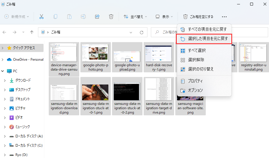 ステップ2. 復元したい写真を選択して、ツールバーの「選択した項目を元に戻す」をクリックします。
