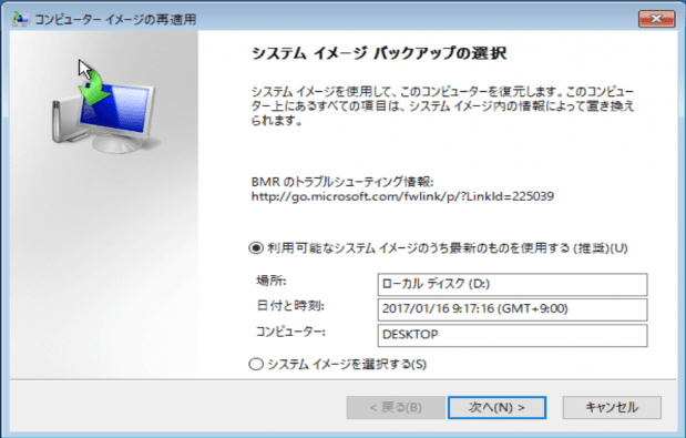 この後、引き続きシステムイメージの復元を行い、古いパソコンで作成したシステムイメージを新しいパソコンに復元することができます。